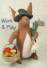The whimsy and humor of the bunnies on these pages have made them much-sought-after by collectors. Here are bunnies engaged in all sorts of human activities, brought to life by a vivid imagination as well as careful attention to detail. The tiny accoutrements are all entirely handmade from fabric, thread and stuffing, with the occasional use of a bit of covered wire or plastic. Please click on images above to go to sub categories.