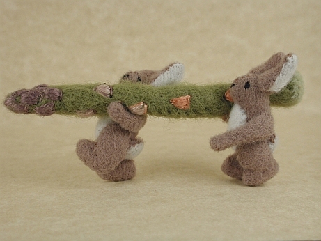 A bumper crop of asparagus, and the garden gnome knows how best to harvest it-with an ax! This hilarious little sculpture features embroidered asparagus spears, thread flowers and tiny stuffed mushrooms.