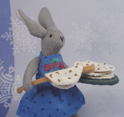 Lefse may be the ultimate Scandinavian treat! A potato dough rolled out thin and baked on a hot griddle, lefse may be spread with butter or sprinkled with sugar, and then rolled up and enjoyed. Some folks use it like a tortilla, rolling up such things as cheese, vegies, peanut butter or tuna. Not sure this is traditional, but it can be VERY good! The lefse these bunnies have made is hand embroidered.